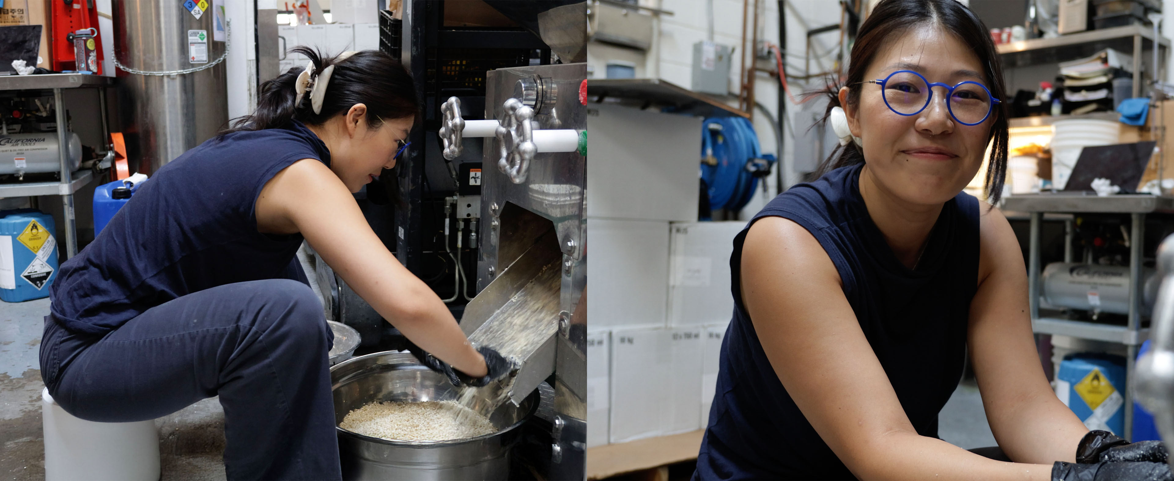 “This machine is cracking the whole of our brown rice, so we get more surface area in the brew,” Alice Jun explains. She’s sitting on an upturned bucket, pulling rice into a bowl with gloved hands. The definition of a hands-on founder.