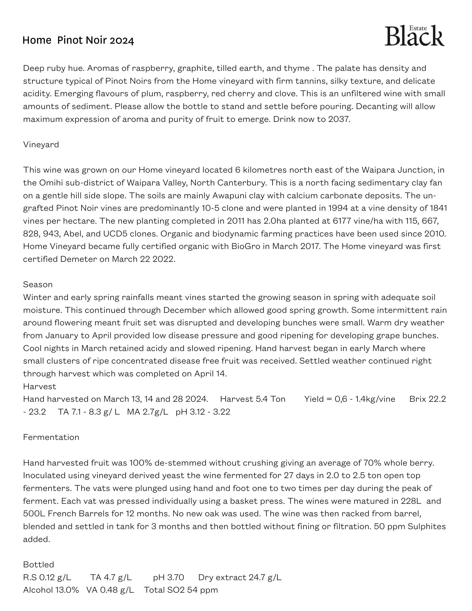 - Planted in 1994, this site is BioGro Certified Organic as of 2017 and Demeter Certified Biodynamic as of 2022