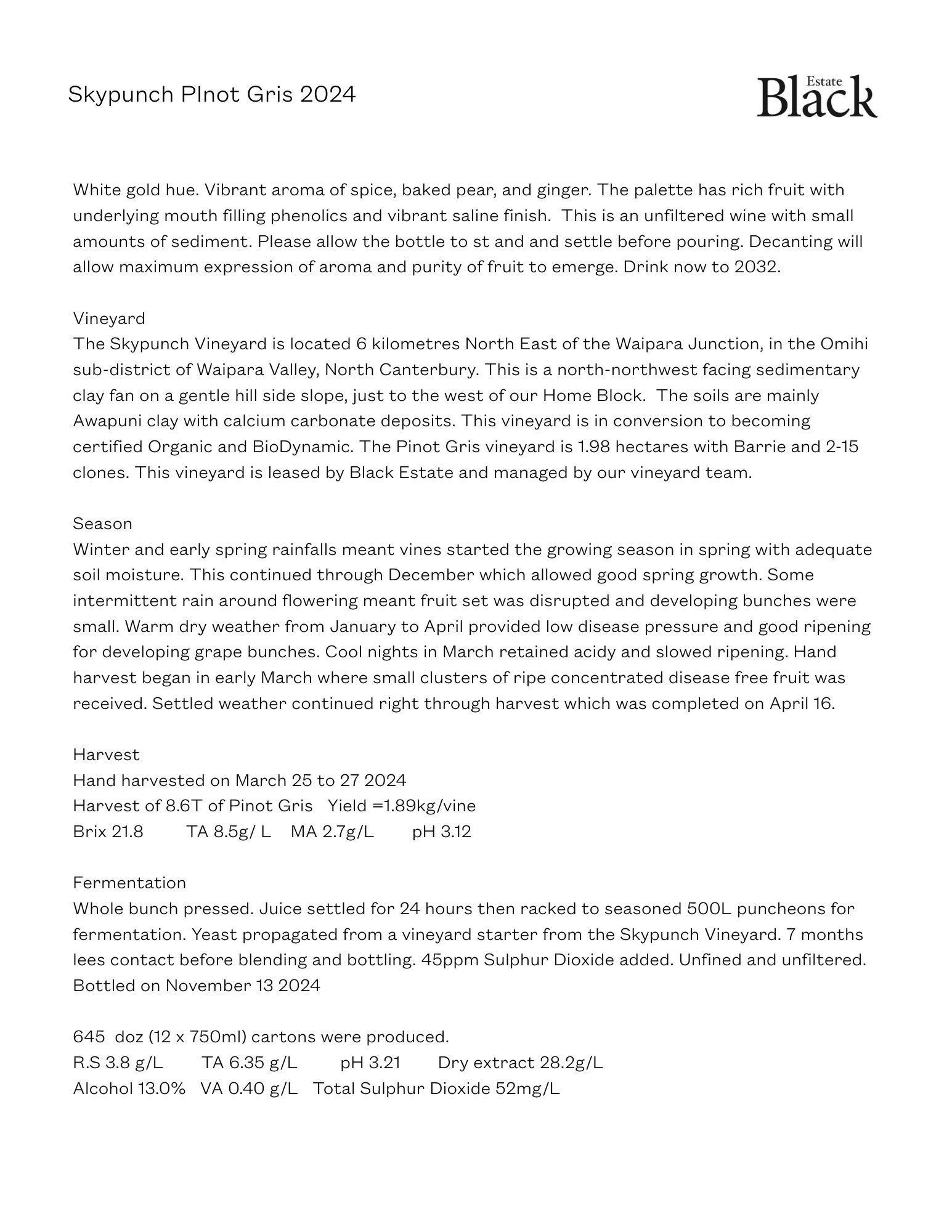 "A new cuvée to me with an excellent name, the 2024 Pinot Gris Skypunch comes from one of the estate's neighbouring vineyards (planted in 2004)"but as I've come to expect from Black Estate, they've made it their own. It was made with minimal intervention: the grapes were hand-harvested, whole-bunch pressed and fermented with natural yeast in 500-liter barrels, and the wine is unfined and unfiltered. Fully dry, the 2024 has a round, curved texture that may come from its clay origins. Still, it remains focused and precise with higher-than-average acidity for Pinot Gris. Peach and toffee apple mingle with roses on the crisp finish. This is a wine you'll keep coming back to."